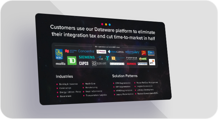 Customers use our Dataware platform to eliminate their integration tax and cut time-to-market in half 100+ organizations use Cinchy (ZERO churn) Industries Solution Patterns ● Banking & Insurance ● Health Care ● CRM Augmentation ● Master/Ref Data Management ● Construction ● Manufacturing ● ERP Augmentation ● Insights Collaboration ● Energy / Utilities / Telco ● Retail / eCommerce ● HRMS Augmentation ● LoB App Development ● Government ● Transportation / Logistics ● Legacy Modernization ● Replace Spreadsheets/EUCs