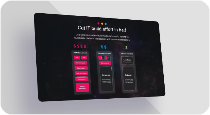 Cut IT build effort in half Use Dataware when building apps to avoid having to build data platform capabilities within every application. $ $ $ $ $ $ $ Traditional Approach Dataware + Pro-Code Dataware + Low-Code UI API UI API Low-Code for User Interfaces Business Logic Business Logic Control Logic Data Abstraction Dataware Dataware Persistence Cross-Application Cross-Application Persistence (ACID) Persistence (ACID) and Data Controls and Data Controls API/ETL Integration