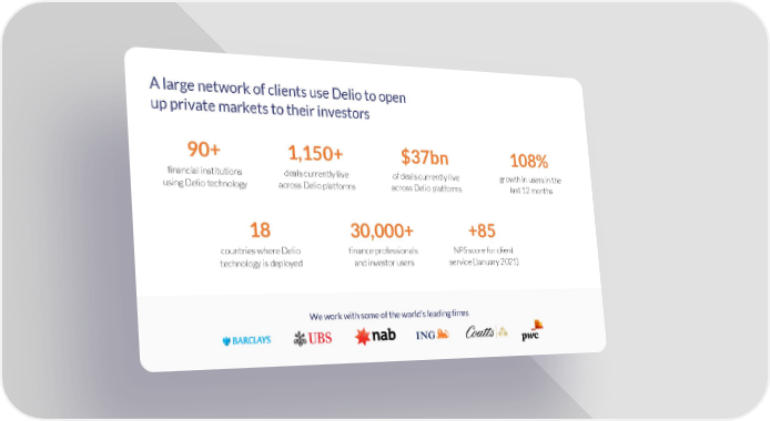 A large network of clients use Delio to open up private markets to their investors 90+ 1,150+ $37bn 108% financial institutions deals currently live of deals currently live growth in users in the using Delio technology across Delio platforms across Delio platforms last 12 months 18 30,000+ +85 countries where Delio finance professionals NPS score for client technology is deployed and investor users service (January 2021) We work with some of the world’s leading firms