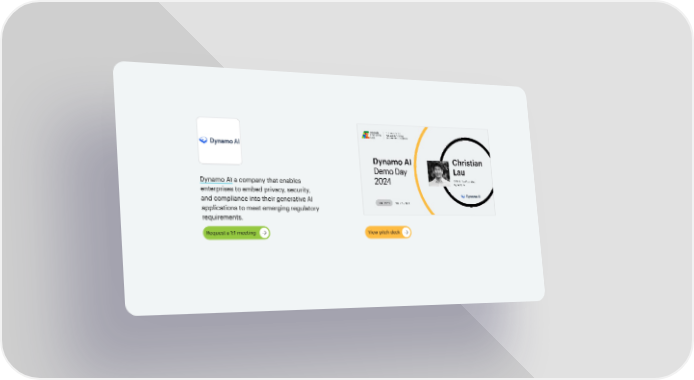 Dynamo AI a company that enables enterprises to embed privacy, security, and compliance into their generative AI applications to meet emerging regulatory requirements. Request a 1:1 meeting View pitch deck Demo Day 2024 Page 8 Page 10Video Player is loading.Play VideoPlaySkip BackwardSkip ForwardMuteCurrent Time 0:00/Duration 0:00Loaded: 0%Stream Type LIVESeek to live, currently behind liveLIVERemaining Time -0:00 1xPlayback RateChaptersChaptersDescriptionsdescriptions off, selectedCaptionscaptions and subtitles off, selectedAudio TrackPicture-in-PictureFullscreenThis is a modal window.Beginning of dialog window. Escape will cancel and close the window.TextColorWhiteBlackRedGreenBlueYellowMagentaCyanOpacityOpaqueSemi-TransparentText BackgroundColorBlackWhiteRedGreenBlueYellowMagentaCyanOpacityOpaqueSemi-TransparentTransparentCaption Area BackgroundColorBlackWhiteRedGreenBlueYellowMagentaCyanOpacityTransparentSemi-TransparentOpaqueFont Size50%75%100%125%150%175%200%300%400%Text Edge StyleNoneRaisedDepressedUniformDrop shadowFont FamilyProportional Sans-SerifMonospace Sans-SerifProportional SerifMonospace SerifCasualScriptSmall CapsResetDoneClose Modal DialogEnd of dialog window.