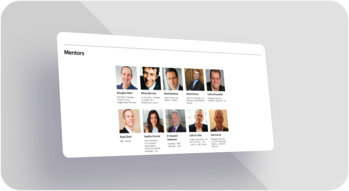 Mentors Douglas Atkin Ethan Berman Noah Breslow Adam Broun Justin Brownhill Portfolio Manager, Co-founder, Chairman Chief Executive Head of Strategy and Managing Partner, Fintech Fund, & former CEO, Officer, OnDeck Business Development, SenaHill Partners, LP Guggenheim Partners RiskMetrics Group Kensho Abel Clark Sophia Corona P. Howard John H. Eley Tom Fortin CEO, Cision Vice President Edelstein Former President and Managing Partner of Corporate Chairman, REDI CEO of Pivot, Inc. & Chief Operating Development, Holdings, LLCF (sold to CME Group) Officer, iCapital Intercontinental Network Exchange, Inc.