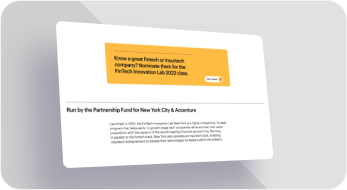 Know a great fintech or insurtech company? Nominate them for the FinTech Innovation Lab 2022 class. Get Started Run by the Partnership Fund for New York City & Accenture Launched in 2010, the FinTech Innovation Lab New York is a highly competitive, 12-week program that helps early- to growth-stage tech companies refine and test their value proposition with the support of the world’s leading financial service firms. Running in parallel to the fintech track, New York also operates an insurtech track, enabling insurtech entrepreneurs to elevate their technologies to leaders within the industry.