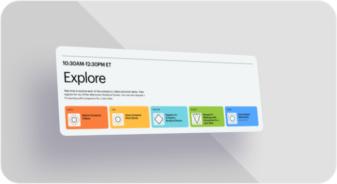 10:30AM-12:30PM ET Explore Take time to explore each of the company’s videos and pitch decks. Then register for any of the afternoon’s Breakout Rooms. You can also request a 1:1 meeting with companies for a later date. WATCH VIEW REGISTER REQUEST LOUNGE Watch Company View Company Register for Request 1:1 Virtual Reality Videos Pitch Decks Company Meetings with Networking Breakout Rooms Companies for a Invite Only Later Date