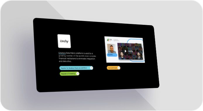 Cinchy’s Data Fabric platform is used by a growing number of the world’s most complex financial institutions to eliminate integration and data silos. Register for Breakout Room at 2:30PM ET View pitch deck Request a 1:1 meeting