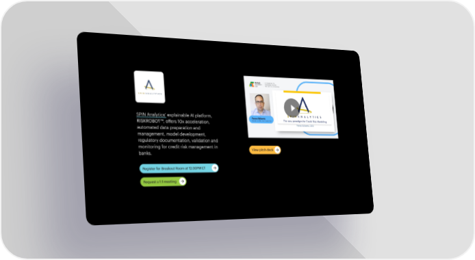 SPIN Analytics’ explainable AI platform, RISKROBOT™, offers 10x acceleration, automated data preparation and management, model development, regulatory documentation, validation and monitoring for credit risk management in View pitch deck banks. Register for Breakout Room at 12:30PM ET Request a 1:1 meeting