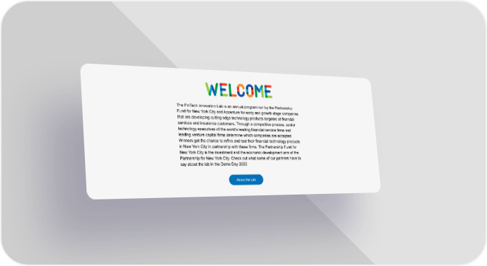 The FinTech Innovation Lab is an annual program run by the Partnership Fund for New York City and Accenture for early and growth stage companies that are developing cutting edge technology products targeted at financial services and insurance customers. Through a competitive process, senior technology executives of the world's leading financial service firms and leading venture capital firms determine which companies are accepted. Winners get the chance to refine and test their financial technology products in New York City in partnership with these firms. The Partnership Fund for New York City is the investment and the economic development arm of the Partnership for New York City. Check out what some of our partners have to say about the lab in the Demo Day 2020 About the Lab