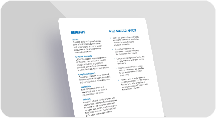 BENEFITS WHO SHOULD APPLY? Access • Early- and growth-stage technology Provides early- and growth-stage companies with innovative solutions enterprise technology companies for financial institutions and with unparalleled access to senior insurance companies. executives at the world’s leading financial institutions. • Non-fintech, growth-stage companies interested in entering In-House Advocate the financial services vertical. CTO/CIOs at each organization serve as the executive sponsor to provide • Companies with a product/service that fintechs with deep engagement is ready to partner with large financial and build connections with relevant institutions. product/business/technology groups. • Core management team must have Long-Term Support ability to relocate to New York City Ongoing connection to our financial for the duration of the program services partners through alumni calls (April-June). and participation in future programs. • There is no fee to apply. For those Mentorship companies accepted into the program, Each company in the Lab is the Lab takes a fee in the form of paired with four to six financial warrant coverage that is significantly and insurance institutions. below industry-standard. Network Powerful network of relationships with key decision makers in financial services, including access to our entrepreneur network, VCs, alumni, the Executive-in- Residence team and the Partnership’s 300+ large corporate members. TIMELINE October 2019 December 2, 2019 March 31, 2020 June 25, 2020 Applications Open Applications Due Program Starts Demo Day
