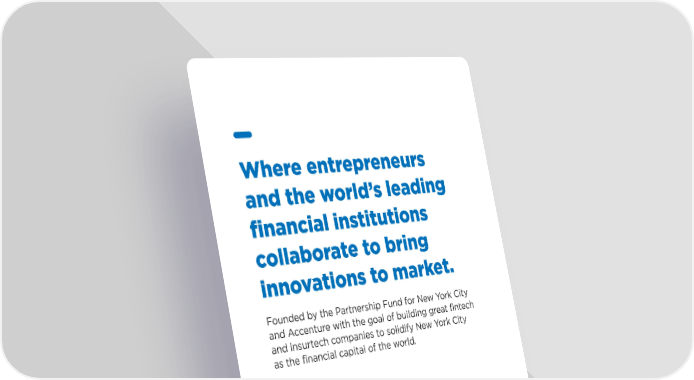 Where entrepreneurs and the world’s leading financial institutions collaborate to bring innovations to market. Founded by the Partnership Fund for New York City and Accenture with the goal of building great fintech and insurtech companies to solidify New York City as the financial capital of the world. fintechinnovationlabnyc.com @FinTechLab [email protected]