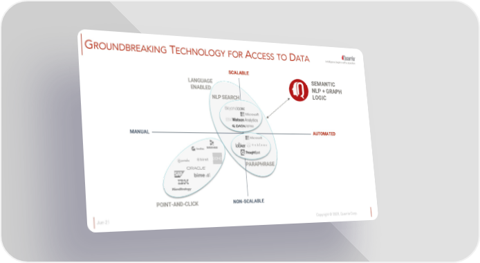 GROUNDBREAKING TECHNOLOGY FOR ACCESS TO DATA Intelligence begins with a question SCALABLE LANGUAGE SEMANTIC ENABLED NLP + GRAPH NLP SEARCH LOGIC MANUAL AUTOMATED PARAPHRASE POINT-AND-CLICK NON-SCALABLE Jun-21 Copyright © 2021, Quarrio Corp.