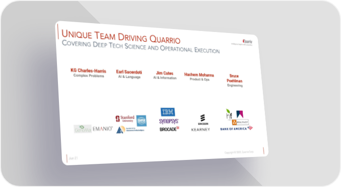 UNIQUE TEAM DRIVING QUARRIO Intelligence begins with a question COVERINGDEEPTECHSCIENCEANDOPERATIONALEXECUTION KG Charles-Harris Earl Sacerdoti Jim Cates HachemMohanna Bruce Complex Problems AI & Language AI & Information Product & Ops Poehlman Engineering Jun-21 Copyright © 2021, Quarrio Corp.