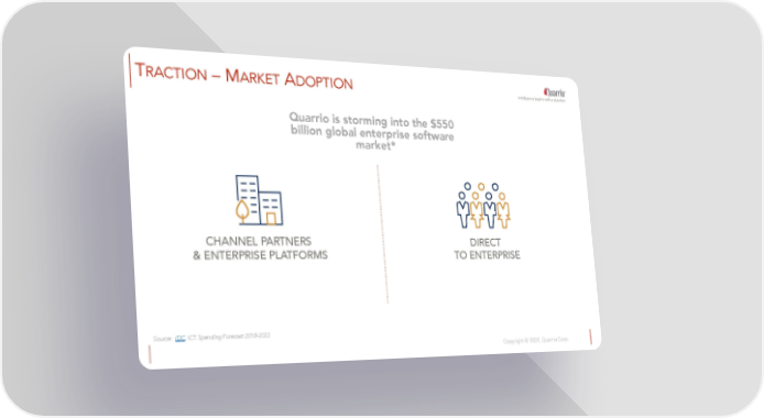 TRACTION – MARKET ADOPTION Intelligence begins with a question Quarrio is storming into the $550 billion global enterprise software market* CHANNEL PARTNERS DIRECT & ENTERPRISE PLATFORMS TO ENTERPRISE Source: IDC, ICT Spending Forecast 2018-2022 Copyright © 2021, Quarrio Corp.