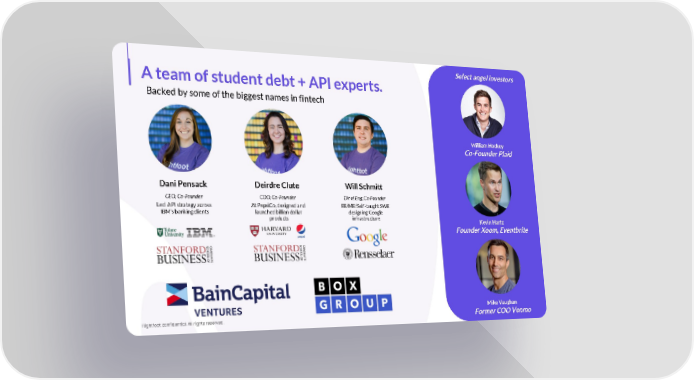 Select angel investors A team of student debt + API experts. Backed by some of the biggest names in fintech William Hockey Co-Founder Plaid Dani Pensack Deirdre Clute Will Schmitt CEO, Co-Founder COO, Co-Founder Dir of Eng, Co-Founder Led API strategy across At PepsiCo, designed and EE/ME/Self-taught SWE IBM’s banking clients launched billion dollar designing Google products infrastructure Kevin Hartz Founder Xoom, Eventbrite Mike Vaughan Rightfoot confidential. All rights reserved. Former COO Venmo