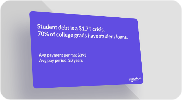 Student debt is a $1.7T crisis. 70% of college grads have student loans. Avg payment per mo: $393 Avg pay period: 20 years Rightfoot Page 1 Page 3