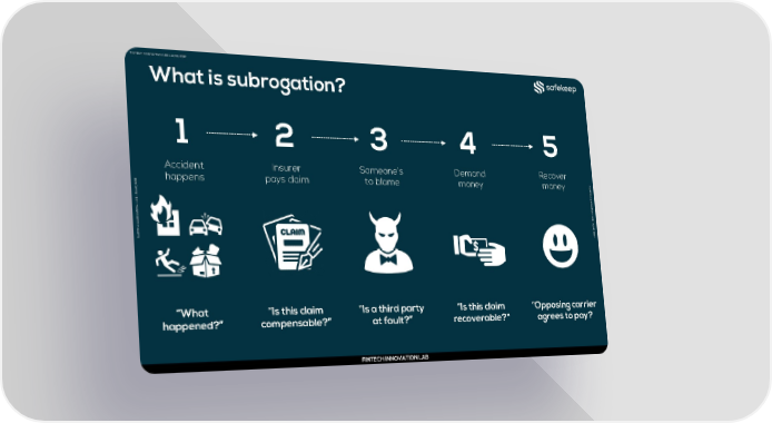 FINTECH INNOVATION LAB | JUNE, 2021 What is subrogation? 1 2 3 4 5 Accident Insurer Someone’s Demand Recover FI 1 happens pays claim to blame money money N 2 T 0 E 2 C H , E I N N U N J O | V B A A T I L O N N O L I T A A B V | O J N U N N I E , H C 2 E 0 T 2 N 1 FI “What “Is this claim “Is a third party “Is this claim “Opposing carrier happened?” compensable?” at fault?” recoverable?" agrees to pay? FINTECH INNOVATION LAB