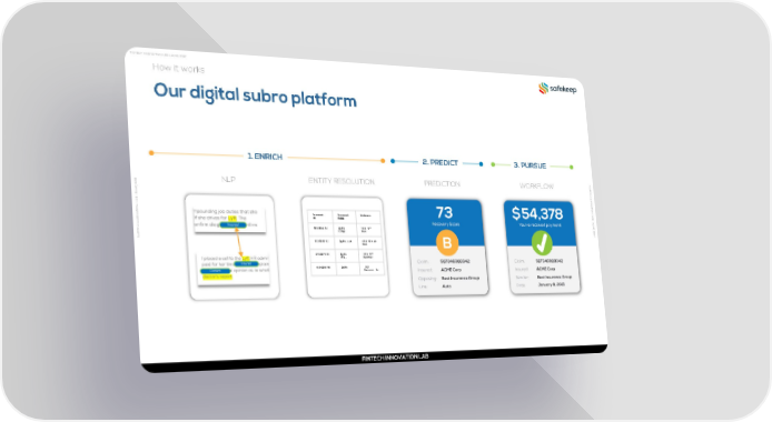 FINTECH INNOVATION LAB | JUNE, 2021 How it works Our digital subro platform 1. ENRICH 2. PREDICT 3. PURSUE FI 1 N 2 NLP ENTITY RESOLUTION PREDICTION WORKFLOW T 0 E 2 C H , E I N N U N J O | V B A A T I L O N N O L I T A A Insured Insured Address B V | ID Name O J N U N N I E , H th C 987345393 Lyft 441 9 2 E Corp Ave 0 T 2 N 1 FI 453454543 Lyft.com 441 Ninth Ave th 697652435 Lyft 441 9 Inc. Avenue 455438798 Lyft 742 Market St FINTECH INNOVATION LAB