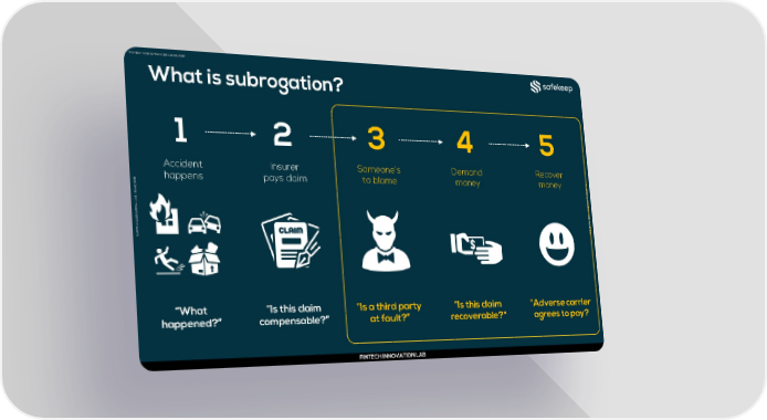 FINTECH INNOVATION LAB | JUNE, 2021 What is subrogation? 1 2 3 4 5 Accident Insurer Someone’s Demand Recover FI 1 happens pays claim to blame money money N 2 T 0 E 2 C H , E I N N U N J O | V B A A T I L O N N O L I T A A B V | O J N U N N I E , H C 2 E 0 T 2 N 1 FI “What “Is this claim “Is a third party “Is this claim “Adverse carrier happened?” compensable?” at fault?” recoverable?" agrees to pay? FINTECH INNOVATION LAB