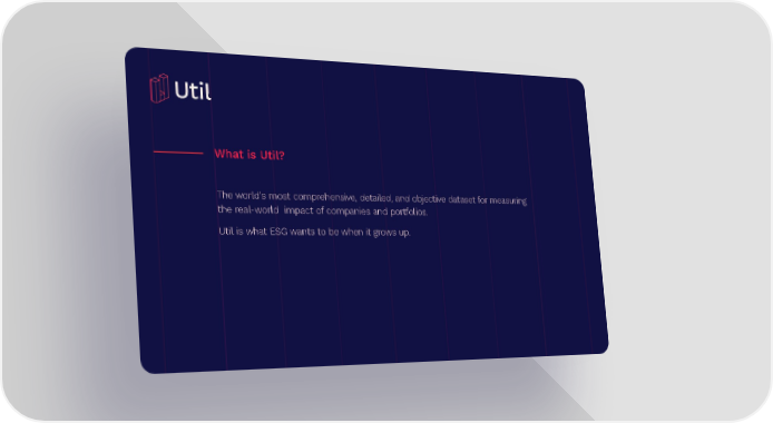 What is Util? The world’s most comprehensive, detailed, and objective dataset for measuring the real-world impact of companies and portfolios. Util is what ESG wants to be when it grows up. Next generation impact analytics 2 Util Page 1 Page 3