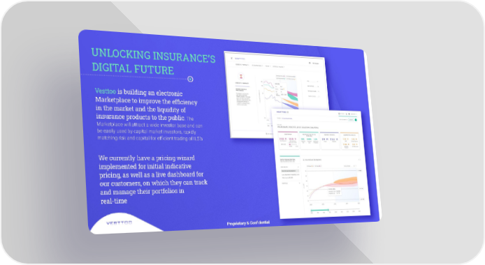UNLOCKING INSURANCE’S DIGITAL FUTURE Vesttoo is building an electronic Marketplace to improve the efficiency in the market and the liquidity of insurance products to the public. The Marketplace will attract a wide investor base and can be easily used by capital market investors, rapidly matching risk and capital for efficient trading of ILS’s We currently have a pricing wizard implemented for initial indicative pricing, as well as a live dashboard for our customers, on which they can track and manage their portfolios in real-time Proprietary & Confidential