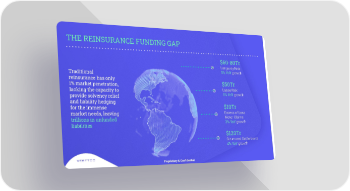 THE REINSURANCE FUNDING GAP $60-80Tr Longevity Risk 5% YoY growth Traditional reinsurance has only $50Tr 1% market penetration, Lapse Risk lacking the capacity to 3% YoY growth provide solvency relief and liability hedging $10Tr for the immense Excess of Loss market needs, leaving Motor Claims trillions in unfunded 3% YoY growth liabilities $120Tr Structured Settlements 4% YoY growth Proprietary & Confidential